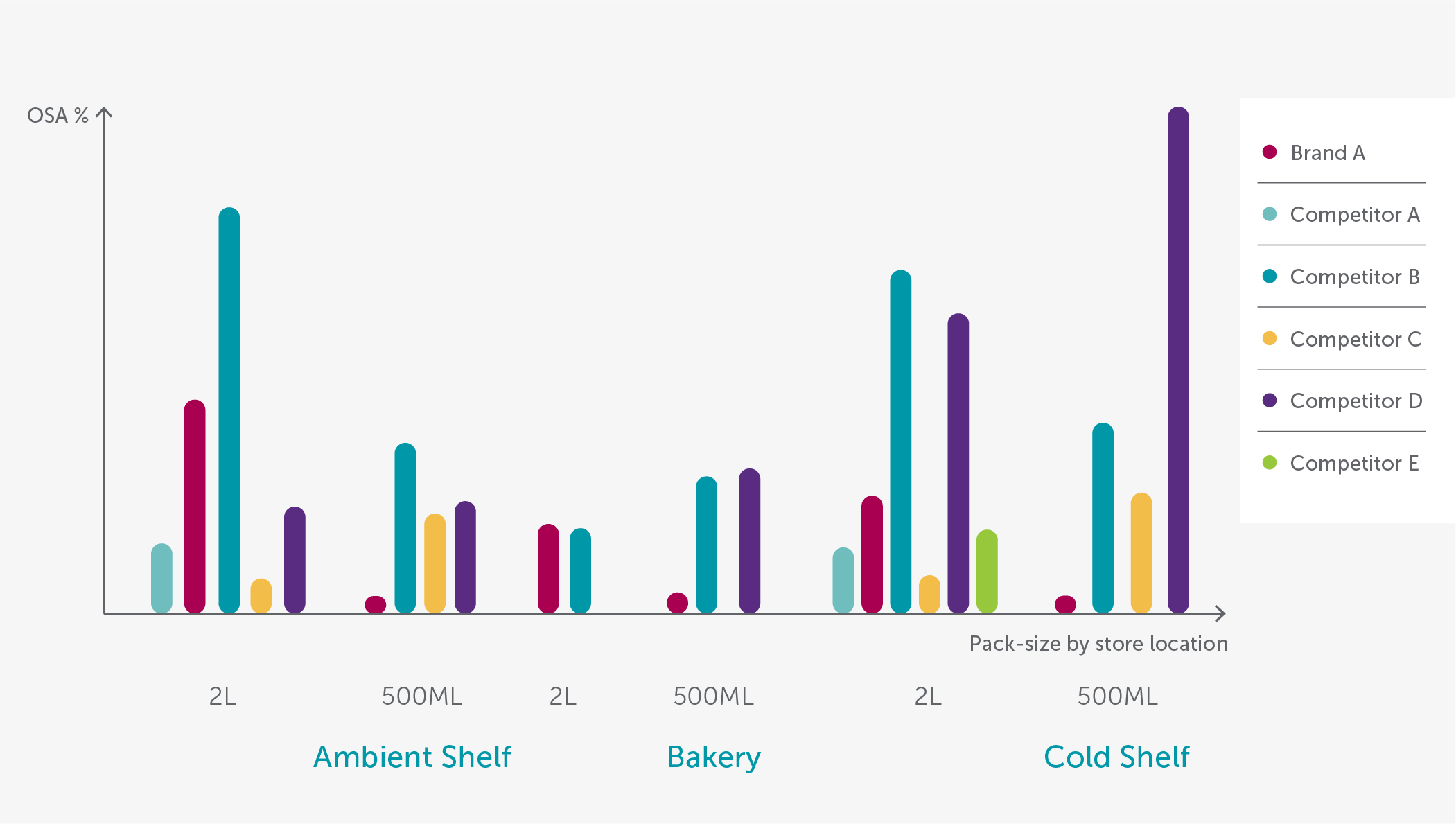 For example, a client used Trax to analyze the performance of its tea category products against that of its competitors. The client narrowed down stores with lower availability rates and then dissected the problem by comparing its OSA rates against those of competitors, not just at a store level but across different shelf placements and locations (Fig 3).