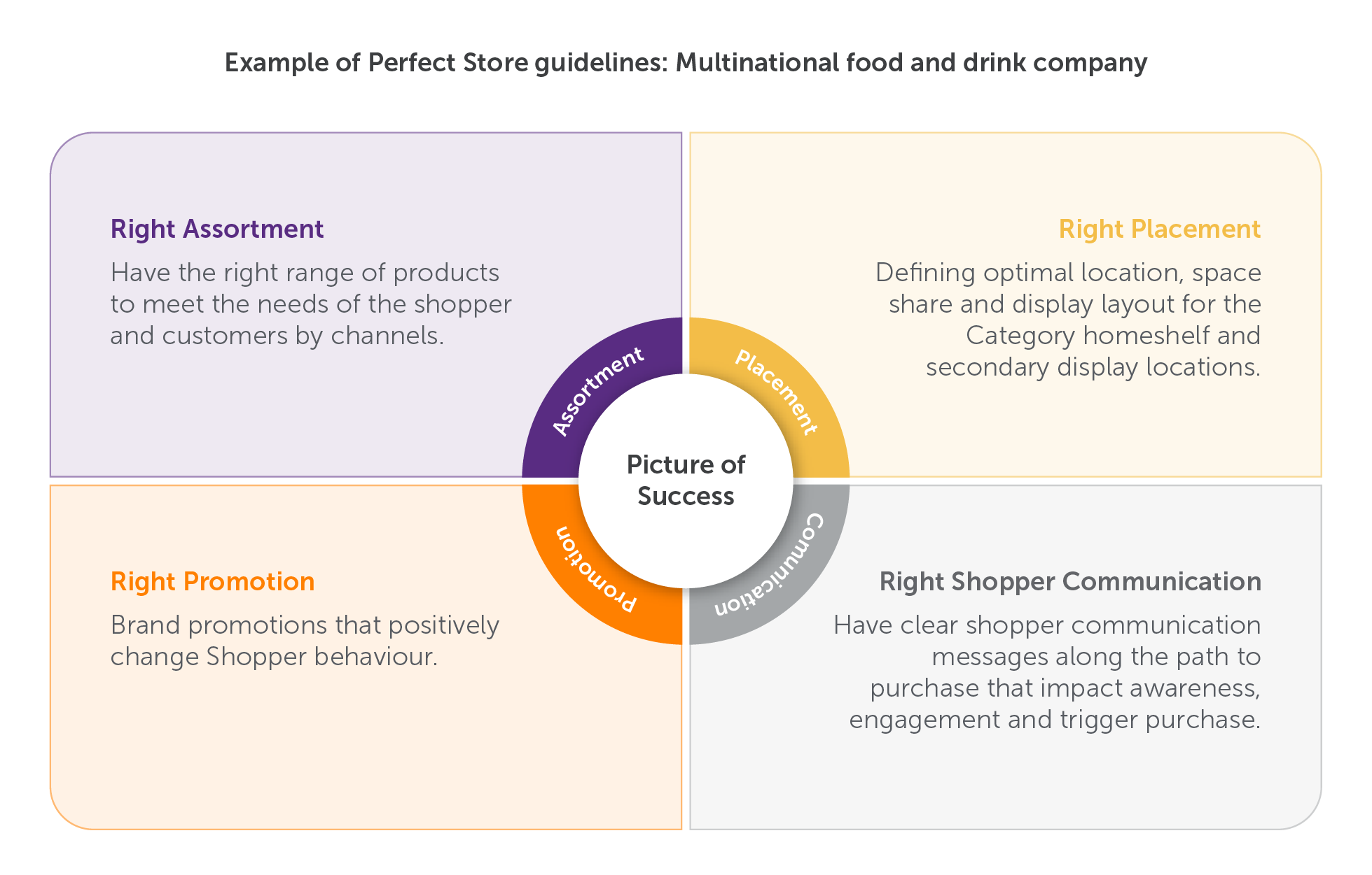 A Perfect Store is one in which consumers can find the right products in the right location, with products presented in the best possible way to influence buying behavior. To achieve this, CPGs design and execute shelf standards that translate shopper-centric insights into practical, scalable and repeatable in-store-execution guidelines.