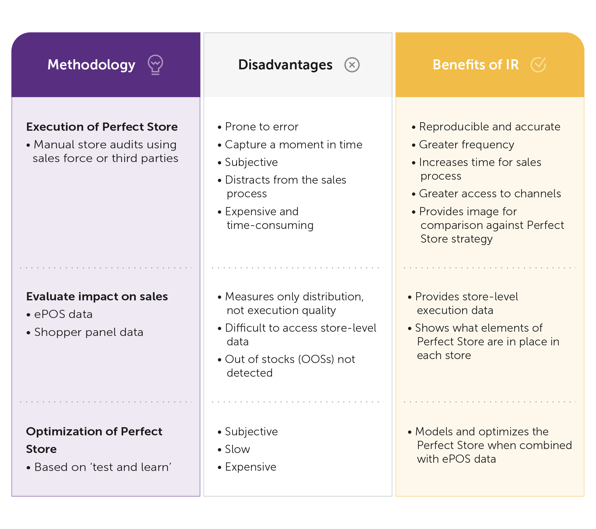 The good news is that you can overcome the limitations of these traditional approaches by using image-recognition (IR) technology (see table below). IR captures images of retail shelves and provides real-time insights into what is happening on every aisle in every store. By seeing what is actually happening on the shelves, you can monitor what elements of your Perfect Store strategy are in place and measure how effective they are.