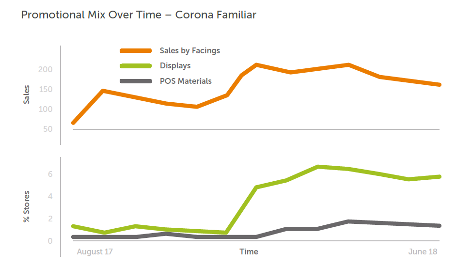 In addition to displays, manufacturers have long relied on POS materials in store to activate promotions and drive more sales. To truly get good return on trade spending, the selection of marketing tactics in-store needs to be scientific and data-driven. For example, the 2018 Beer Shelf Pulse report found that using promotional materials in store has had a strong correlation to sales over time for Bud Light. For Corona, on the other hand, displays are more influential in driving sales.