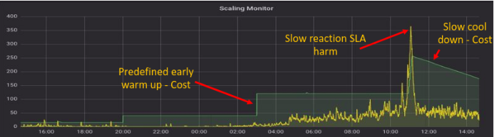As the chart indicates, relying on out-of-the-box metrics to monitor capacity utilization every 5 minutes results in incurring costs on machines that are not in use, as well as harming service levels by running inadequate machines (e.g. between 10.00 and 12.00 on the chart).
