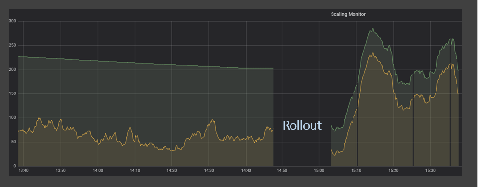 As we’ve established in the previous sections, relying on scaling metrics only once in 5 minutes is not only costly but also hampers service levels and customer satisfaction. To overcome this, we developed a service that measures queue depth and messages in process every second via API. Comparing the old sampling method with the new, the improvements were very clear. In the illustration below, the demand (yellow line) never exceeds the supply (green line).