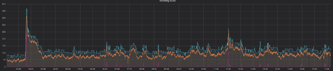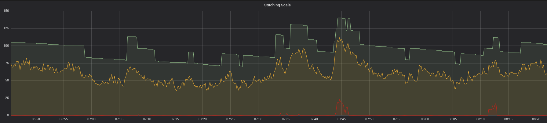 This shows a perfect correlation between the expected (orange line) and the actual machines (blue line), with sufficient amount of spare compute power. The amount of time for which the oldest message resides in the queue before being processed (red line) is consistently low, spiking only for very short periods of time.