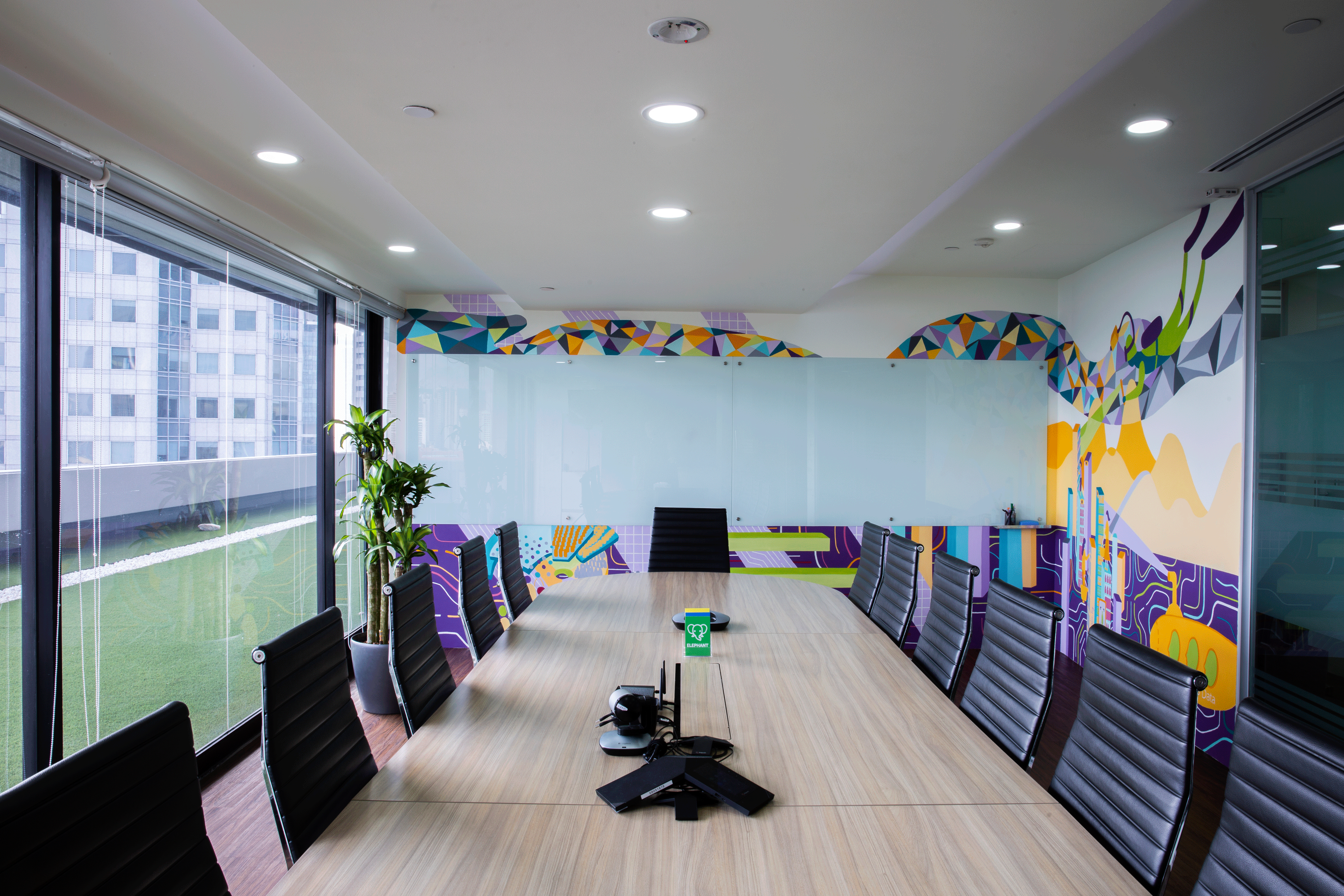 I also used Trax’s brand colours and iconography to represent its products, such as the neural-network pattern. These formed the project’s framework. From there, I brainstormed a concept that would suit the reception area, the boardroom, the demo room and the social area. The main anchor for the whole project was ‘diving into data.’