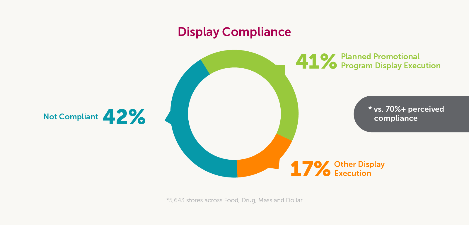 This store-level analysis showed that 42 per cent of displays were noncompliant with the plan, but CPGs assumed compliance rates of 70 per cent or more!