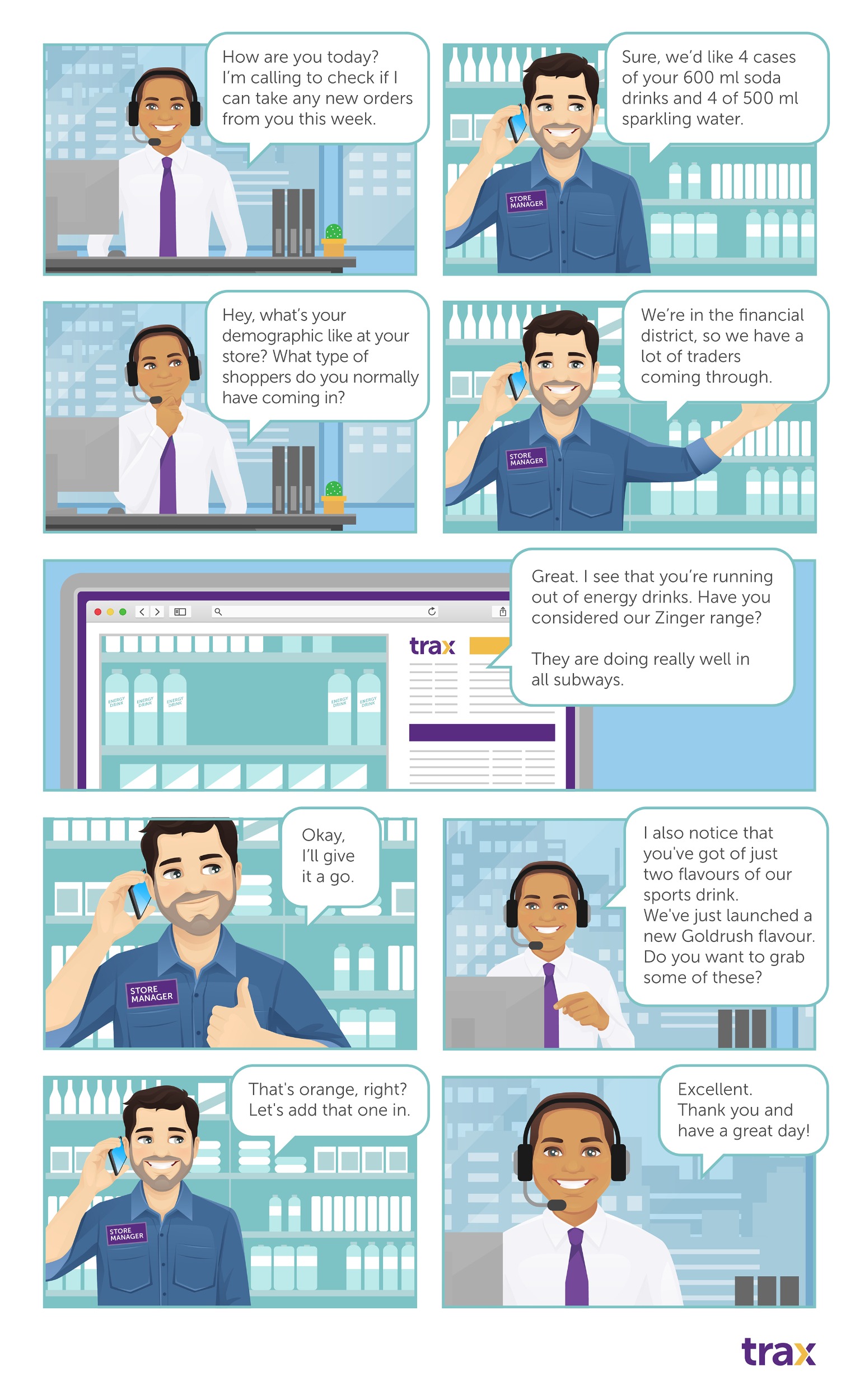 Here’s a typical interaction between a telesales agent and a retail store manager: