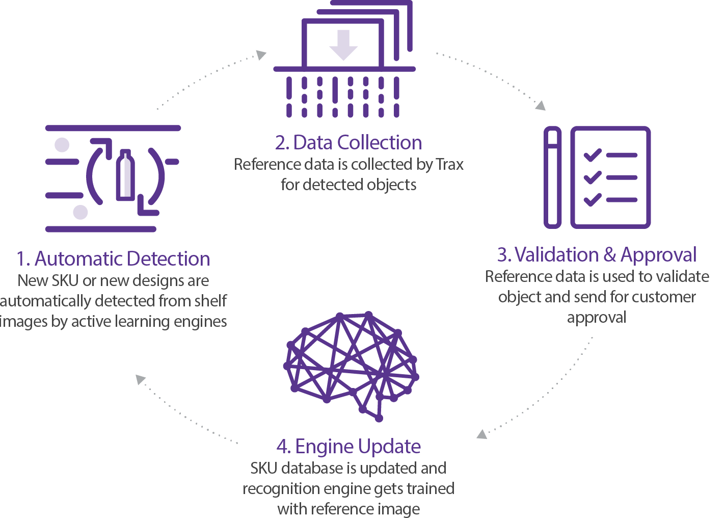To prevent this, Trax has developed an ongoing monitoring service based on a well-designed algorithm and running on an active learning engine. So, every time a new product or design is detected by the system, the identity of this product is inferred using reference data, validated and then updated on the database.