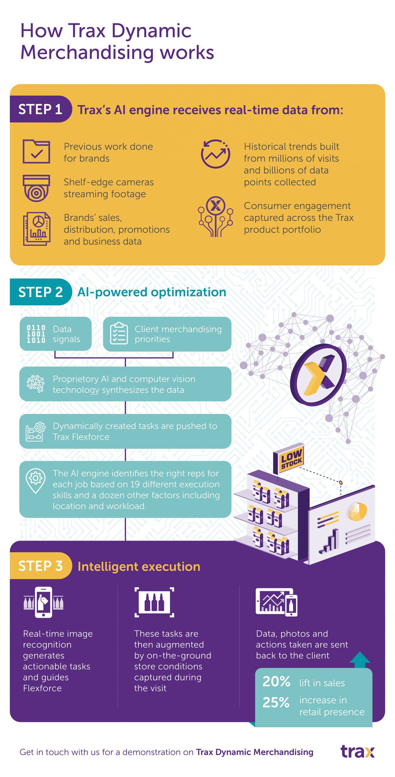 Get in touch with us for a demonstration on how Trax’s AI-driven Merchandising can help drive up to 20 percent lift in sales and 25 percent increase in retail presence by doing the right work, at the right store, at the right time.