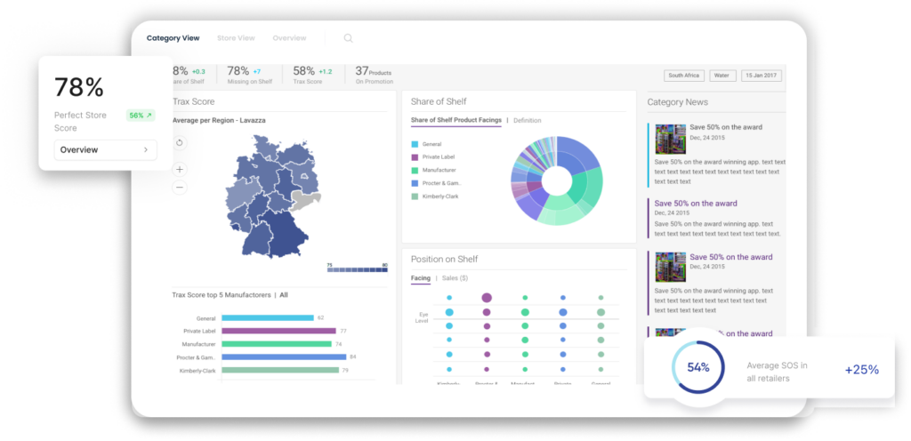 Σε ένα μοναδικό dashboard, η Trax παρέχει αναλυτική απεικόνιση όλων των επισκέψεων που έχουν πραγματοποιηθεί, ώστε να παρακολουθήσετε την απόδοση των KPIs που εσείς έχετε θέσει. Ψάξτε βαθύτερα σε επίπεδο καταστήματος και δείτε την εικόνα του ραφιού όπως πραγματικά είναι, αποτυπώνοντας SKUs τόσο του brand σας όσο και του ανταγωνισμού, έχοντας παράλληλα πλήρη ανάλυση πλανογράμματος ανά retailer.